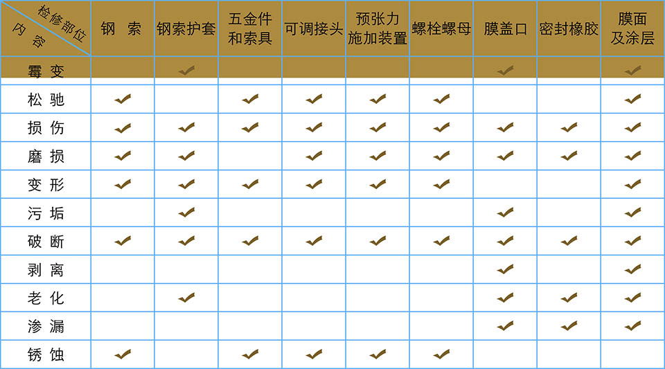 Inspection mainly covers the membrane material for large deformation, membrane material is due to the loss of pretension is flabby, partially torn whether membrane material, membrane material coating whether stripping, cable is loose, the paint is peeling off, etc.