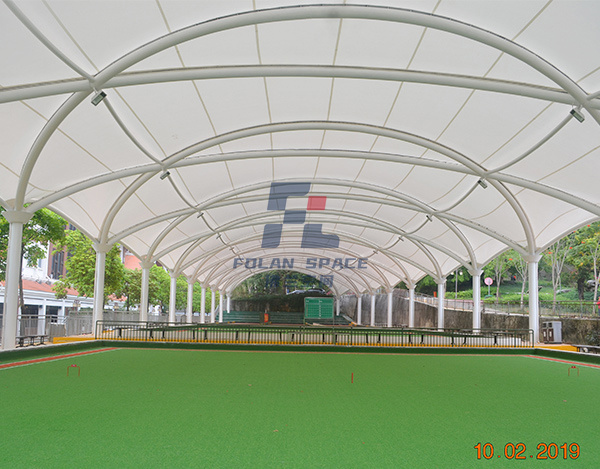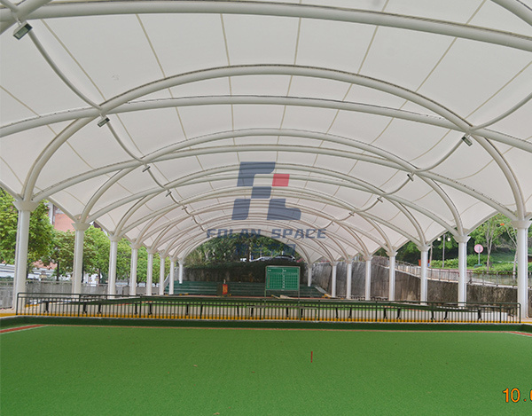 蓋頂材料選擇PVDF建筑膜材,這種材料具有透光、輕巧、抗風(fēng)、自潔、安裝快、無污染等特點(diǎn),建成后,不但可以遮陽擋雨,與公園旁邊的綠樹相襯,又可成為一道新的風(fēng)景。