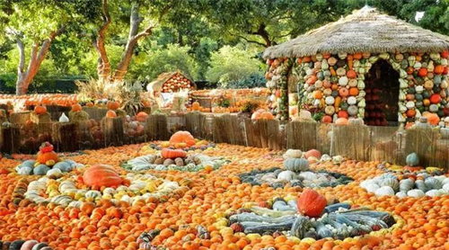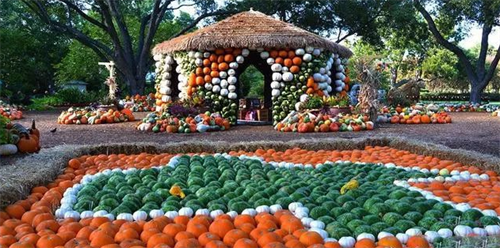 南瓜除了用于木雕,石雕,磚雕等,還能直接用于建造和裝飾房子。在美國達拉斯植物園,有一個叫羅里邁耶斯兒童冒險樂園的特色兒童游園,全場都用瓜果蔬菜打造,共計花了5000個南瓜。它不光用南瓜來建造房子,還用南瓜裝飾花園、街道,門廊等。整個兒童樂園,布滿了日常餐桌上的瓜果蔬菜,可讓孩子親近自然、熱愛自然。