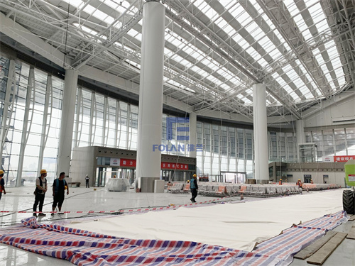 近期,佛蘭空間正在施工的虎門(mén)高鐵站精裝修室內(nèi)天花吊頂就運(yùn)用了PTFE軟膜。