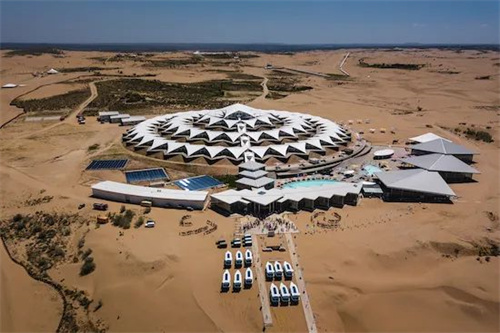 在一片茫茫沙海中,目光所及的只有藍天,白云,沙漠,以及蓮花狀的響沙灣酒店,設計充分融合沙漠文化,給人感官上的新鮮感,建筑結構及膜材的運用充滿未來感和科技感。