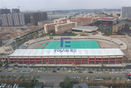 根據(jù)校方需求,佛蘭空間結(jié)合新校區(qū)已有建筑元素,精心設(shè)計(jì)了學(xué)校體育看臺、長廊,門頭等9處膜結(jié)構(gòu)建筑。