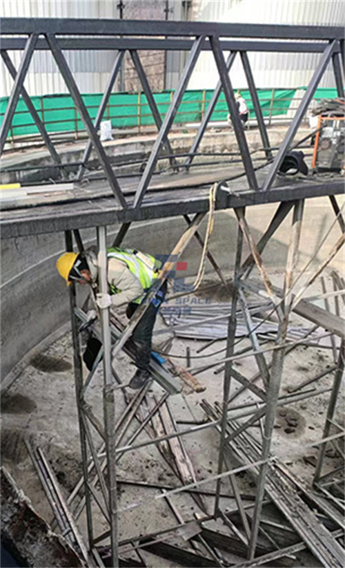 2023年末,佛蘭空間在九江接到了一個(gè)污水池改造升級(jí)項(xiàng)目,原有的半橋工作污水池,其頂部覆蓋著鋼結(jié)構(gòu)彩鋼板棚子,經(jīng)過歲月的洗禮,棚子、工作橋以及輪子周邊的鋼構(gòu)都已銹跡斑斑。這不僅影響了廢氣收集的效率,還為安全埋下了隱患。