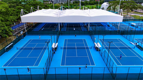 該三片風(fēng)雨棚場地,由深圳市佛蘭空間膜結(jié)構(gòu)有限公司設(shè)計建造完成,高穹頂設(shè)計與流線,暢享風(fēng)雨無阻的網(wǎng)球體驗!該網(wǎng)球場已于2024年7月1日起正式開放線上預(yù)定,實景美圖先讓大家一睹為快!