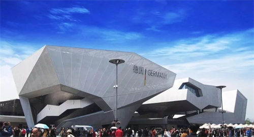 德國館外立面運(yùn)用的是法拉利View381,材料柔軟,金屬銀涂層和28%的開孔率,能起到很好的遮陽和隔熱效果。在燈光的映襯下,德國館彰顯朦朧美和金屬質(zhì)感,整體輕盈、飄逸。