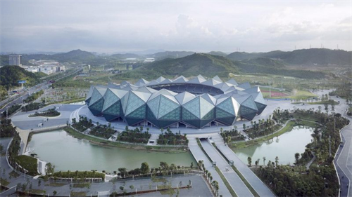 深圳大運(yùn)會體育中心,外觀類似“鉆石”,結(jié)構(gòu)外層采用陽光板及玻璃幕墻,內(nèi)層使用透光率高、吸音性強(qiáng)、自潔性好的PTFE網(wǎng)格內(nèi)膜,面積超過10萬平方米。