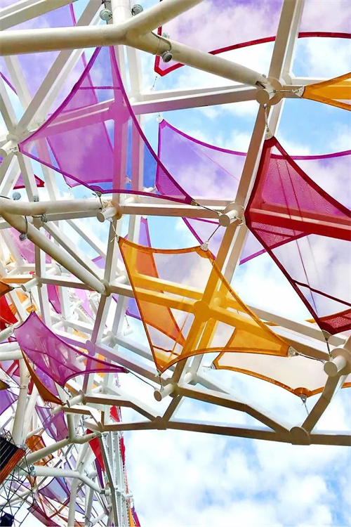 網(wǎng)格膜因其特殊的結(jié)構(gòu)和開孔率,能夠?qū)崿F(xiàn)不同程度的透光效果,其材質(zhì)和顏色也可根據(jù)實(shí)際需求進(jìn)行選擇,從而實(shí)現(xiàn)個性化的景觀設(shè)計。因此,網(wǎng)格膜在景觀領(lǐng)域也有廣泛運(yùn)用,可遮陽,可塑造當(dāng)?shù)鼐坝^。
