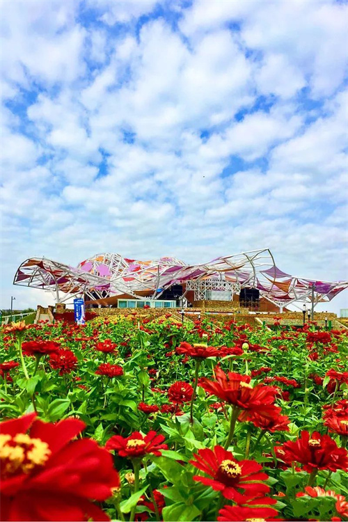 劇場屋頂由三層膜構(gòu)成,中間采用透明ETFE膜用以遮雨,上下兩層采用法拉利Soltis frontview 381網(wǎng)格膜遮陽,定制成粉、黃、紫三色,與周圍花海顏色相呼應(yīng)。