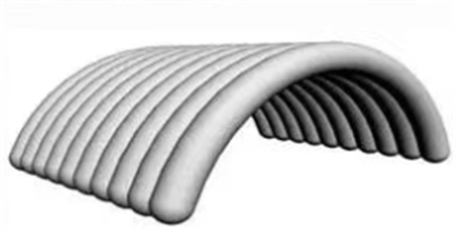 氣肋式膜結(jié)構(gòu)是一種采用高壓氣肋作為支承體系的充氣膜結(jié)構(gòu),通過(guò)將多根氣肋連接成整體的方式創(chuàng)造出使用空間,具有輕質(zhì)便攜、可快速運(yùn)輸、低耗能、安全可靠等優(yōu)點(diǎn)。