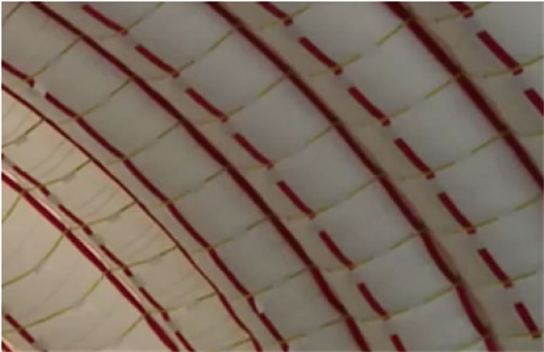 富士館采用氣肋式膜結(jié)構(gòu),結(jié)構(gòu)跨度50m。該館由16根直徑4m、長(zhǎng)78m的拱形氣肋圍成,氣肋間每隔4m用寬500mm的水平系帶把他們環(huán)箍在一起。呈半圓拱形,最高點(diǎn)向外突出7m。