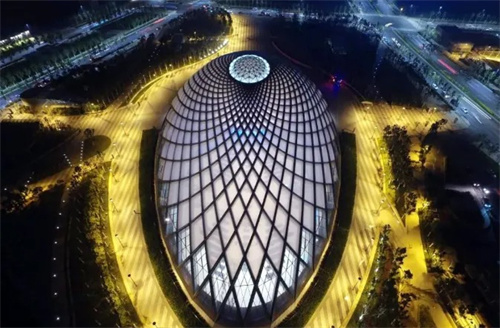 國(guó)際最大單殼體膜結(jié)構(gòu),其雙螺旋穹頂由783個(gè)大小不同的ETFE氣枕組成,長(zhǎng)143米,寬80米,形成了獨(dú)特的“貝殼”造型。該設(shè)計(jì)不僅美觀,還解決了大跨度空間的保溫、透光和隔熱難題,同時(shí)配置了消防熔斷系統(tǒng),確保了消防安全。
