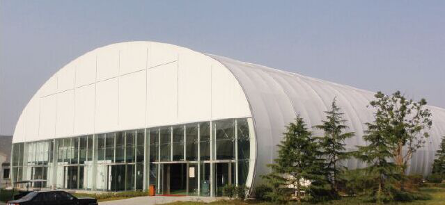 膜結構建筑:采用高強度聚酯纖維編織、表面涂有高強自潔性涂層的建筑膜材,在鋼結構、鋼索或充氣結構作用下成型。具有審批快、造價低廉,節(jié)約投資;氣密性好,保溫隔熱;防火阻燃、大跨度,大空間;結構簡單,施工周期短;環(huán)保;使用壽命15年以上等特點。