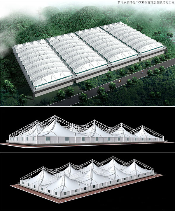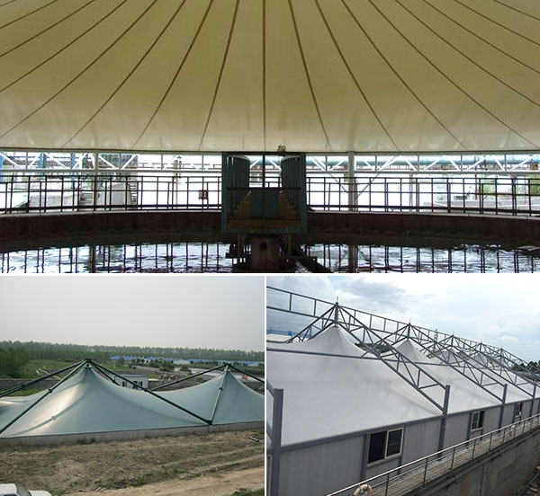 2、適用于大跨度池體:膜材經(jīng)過(guò)特殊的UV光固化處理和防霉、防腐及防菌處理后防腐性能十分優(yōu)越,自重很輕,抗拉強(qiáng)度高,對(duì)大跨度結(jié)構(gòu)極具優(yōu)勢(shì);