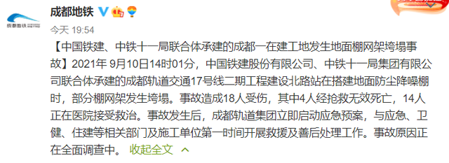 據(jù)央視網(wǎng)消息:據(jù)@成都地鐵微博發(fā)布的消息,2021年 9月10日14時(shí)01分,中國(guó)鐵建股份有限公司、中鐵十一局集團(tuán)有限公司聯(lián)合體承建的成都軌道交通17號(hào)線二期工程建設(shè)北路站在搭建地面防塵降噪棚時(shí),部分棚網(wǎng)架發(fā)生垮塌。