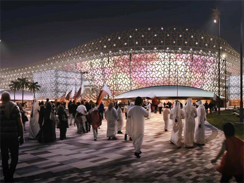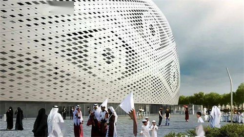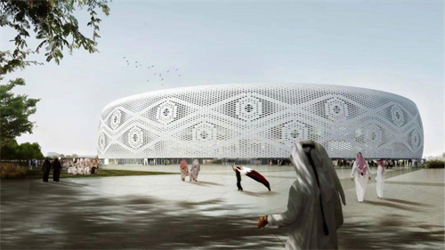 盧賽爾球場的外觀以椰棗碗和琺瑯燈籠為設(shè)計(jì)靈感,幕墻三角形網(wǎng)格立面效果展現(xiàn)了卡塔爾傳統(tǒng)燈籠紋飾,整體呈馬鞍型,遠(yuǎn)觀整個(gè)球場像是沙漠中的一只金碗。
