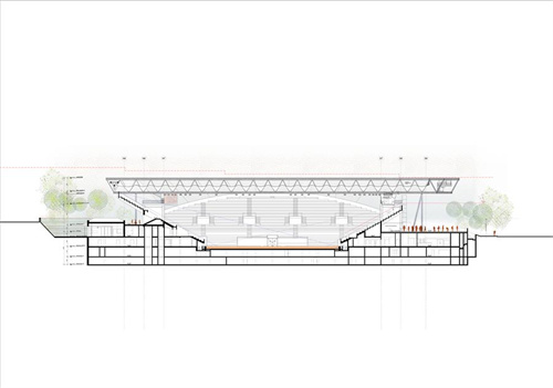 設(shè)計(jì)方案覆蓋現(xiàn)有看臺,并向兩側(cè)懸挑。折疊開合式屋頂一部分由高密度建筑膜材構(gòu)成,其固定部分的結(jié)構(gòu)構(gòu)件則提供展開和移動所需的支撐。所有構(gòu)件的設(shè)計(jì)均出于力學(xué)考慮,并不作為裝飾使用。