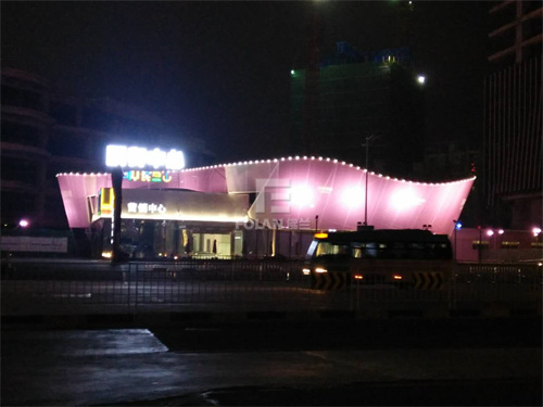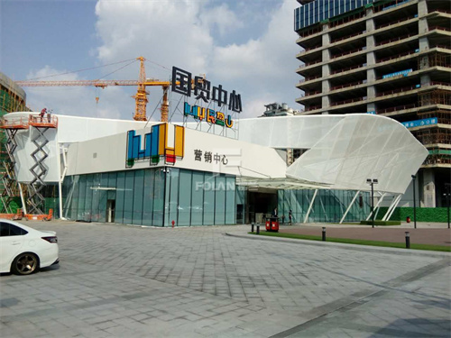 商業(yè)中心外立面使用膜結(jié)構(gòu),不僅造型獨(dú)特,曲線優(yōu)美,夜晚隨著燈光的變幻,整個(gè)建筑還五彩斑斕。佛蘭空間就曾在東莞建造過一個(gè)臨時(shí)國貿(mào)營銷中心,其外立面采用骨架式結(jié)構(gòu)覆蓋網(wǎng)格膜,夜晚景觀十分壯美。