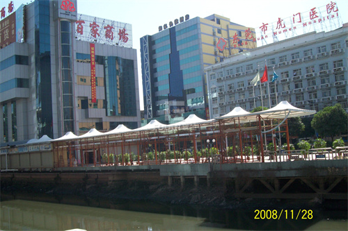 除了外立面和蓋頂,現(xiàn)在很多商業(yè)街都流行建造商業(yè)景觀,佛蘭空間就曾為東莞虎門百家商場建造吊帽形狀的長廊,這些膜結(jié)構(gòu)涼亭不僅可供顧客停腳歇息,還能遮陽避雨。