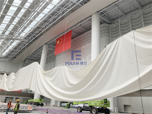 虎門高鐵站這塊100米長的PTFE軟膜吊裝,堪稱國內(nèi)首次100米長跨度軟膜吊裝工程,這也是佛蘭空間首次完成這么長跨度的軟膜吊頂安裝工程。