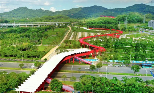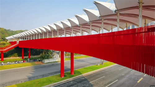 若你們想去深圳旅游,一定要去深圳最美“紅飄帶”——光明虹橋公園。其中“虹橋”全長4公里,是全國第二大鋼結構單柱多曲景觀橋。入口處,設有一段造型獨特的白色PTFE膜結構,飄逸又壯美!