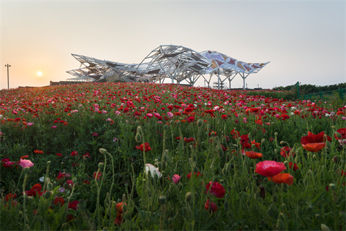 若你們想去江蘇,一定要去宿遷三臺山公園看看,一座大型景觀建筑劇場矗立于花海之間。劇場能容納3000座室外觀眾席,有可遮蔽的屋頂覆蓋。屋面三層張拉膜,中間透明膜遮雨,上下兩層彩色膜遮陽。彩色膜有粉,黃,紫三種顏色,與花田相呼應。