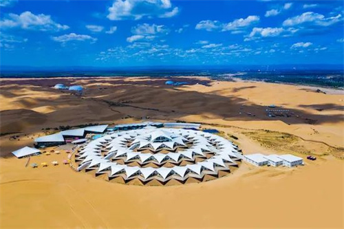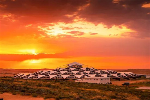在一片茫茫沙海中,目光所及的只有藍天,白云,沙漠,以及蓮花狀的響沙灣酒店,設計充分融合沙漠文化,給人感官上的新鮮感,建筑結構及膜材的運用充滿未來感和科技感。