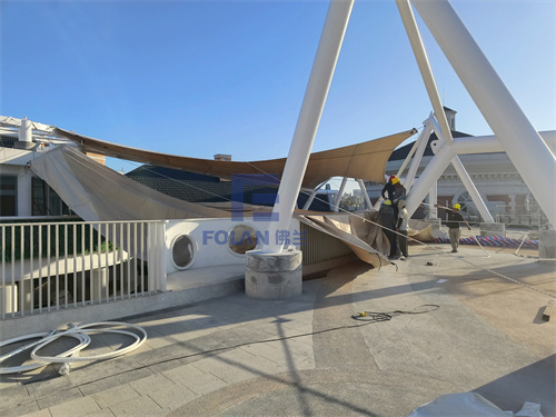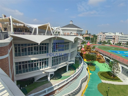 佛蘭空間設(shè)計和項目施工人員,經(jīng)過結(jié)構(gòu)優(yōu)化設(shè)計、變形分析、安裝措施及高精度測量控制,最大限度消除了安裝過程中可能帶來的結(jié)構(gòu)的變形,保證了該幼兒園中庭膜結(jié)構(gòu)的美觀性,同時還為小朋友玩耍提供了一個能遮陽擋雨的溫馨空間。