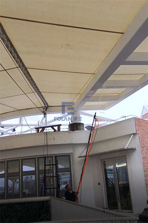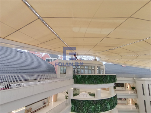 因幼兒園白天上課,所以項目只能周末和晚上施工,佛蘭空間項目施工人員趕工夜戰(zhàn),歷時20天完成了該扇形中庭膜結(jié)構(gòu)的安裝。
