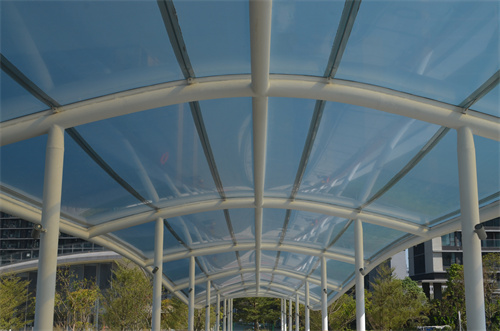 該天橋長92米,寬8.2米,面積約716平方米,是國內(nèi)首例采用單層ETFE新型隔熱膜材的天橋。膜材厚度250um,遮陽系數(shù)0.64,熱增益系數(shù)0.56,透光率55%一60%,防火級別為B1級。新型隔熱材料的選擇,為天橋上來來往往的行人提供了舒適的溫度。