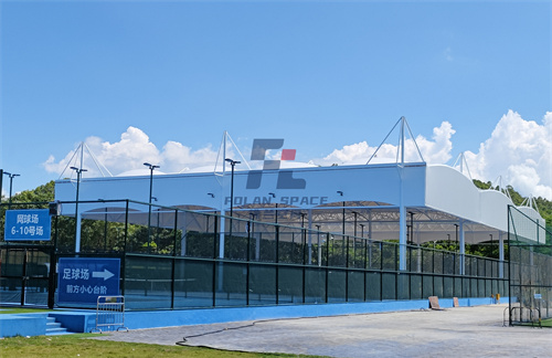 6月,佛蘭空間在深圳大運中心新竣工了一座膜結構網球場,該膜結構可覆蓋三片網球場地,投影面積達2500㎡,采用PVDF膜材,高穹頂設計與流線,四周增加立面膜材,可防西曬和掃雨,給網球愛好者擁有風雨無阻的打球體驗。