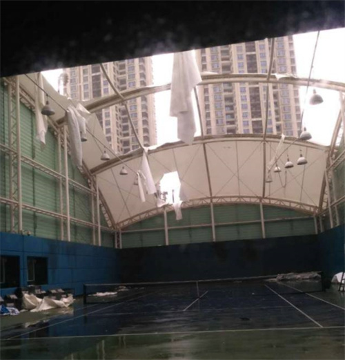 可能有的膜材使用年限已久,膜材抗拉強度降低,在臺風(fēng)暴雨的影響下,會造成膜面積水,膜面兜水嚴重的話會造成膜結(jié)構(gòu)坍塌。