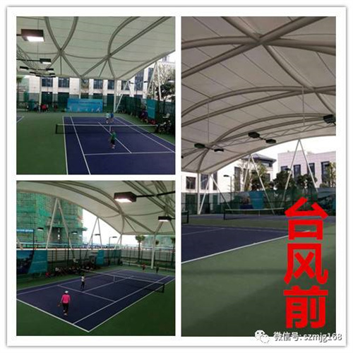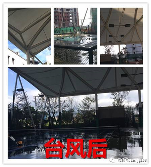 所以,只要是按經(jīng)過計算分析的施工圖紙施工,選用的是符合或高于設(shè)計參數(shù)的膜材,膜結(jié)構(gòu)施工安裝符合規(guī)范,沒偷工減料,一般能抵御臺風(fēng)暴雨的侵襲。