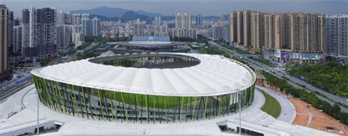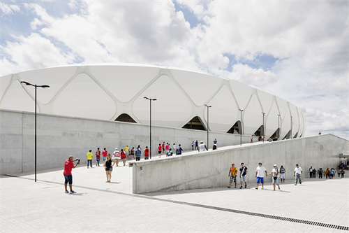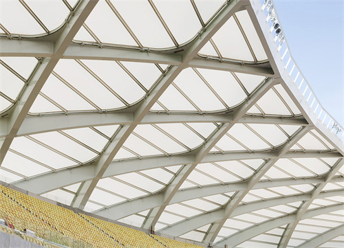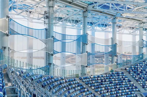 體育場(chǎng)頂棚是半開放式的PTFE膜結(jié)構(gòu),純白的顏色和獨(dú)特的造型引人注目,頂棚可遮蓋所有的席位,使游客坐在席位上觀看比賽免受日曬雨淋。