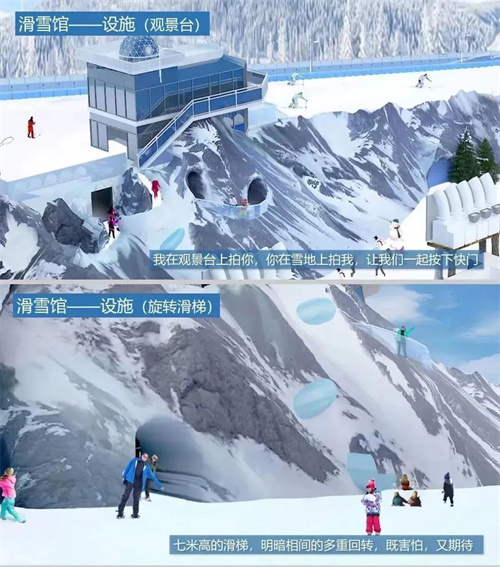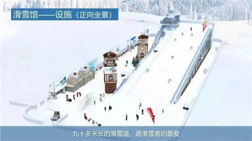 滑雪館內(nèi)的滑雪道長(zhǎng)約90米、寬20米,出發(fā)平臺(tái)高度10米,滑雪者可乘坐魔毯上升到出發(fā)平臺(tái)。滑雪館以經(jīng)典雪域風(fēng)光為主題,打造網(wǎng)紅打卡點(diǎn)。