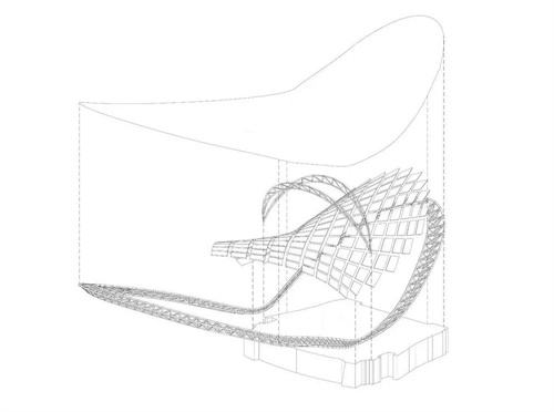 新建的屋面為獨(dú)立結(jié)構(gòu),觀眾坐在階梯型座位上,舞臺(tái)屋面在視線角度方向向上仰起,舞臺(tái)背后的景色盡收眼底成為真實(shí)的背景板。