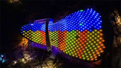 膜結(jié)構(gòu)分內(nèi)外兩層,起遮蔽作用的外層為雙向預(yù)應(yīng)力PVDF膜,內(nèi)膜為網(wǎng)格膜材。正是因?yàn)楠?dú)特的材質(zhì),其內(nèi)膜可形成超過(guò)5000平方米的沉浸式可投影天幕,這在國(guó)內(nèi)都屬罕見(jiàn),也成為在此演出的最大亮點(diǎn)。