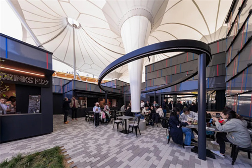 張拉膜結(jié)構(gòu)選用的是PTFE涂層玻璃纖維膜,這種材料具有出色的自潔性、耐候性,以及良好的透明度和光學(xué)性能。PTFE膜材在建筑領(lǐng)域應(yīng)用廣泛,特別適合構(gòu)建輕質(zhì)、透明度高的建筑外立面。