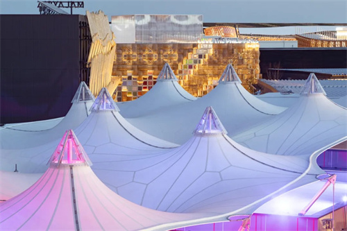 盧森堡館的外在建筑采用現(xiàn)代張拉膜結(jié)構(gòu),這種結(jié)構(gòu)利用高強(qiáng)度的柔性薄膜材料,通過拉索或剛性支撐結(jié)構(gòu)施加張力,形成穩(wěn)定的曲面。張拉膜結(jié)構(gòu)的優(yōu)勢(shì)在盧森堡館設(shè)計(jì)中得以充分展現(xiàn)。它不僅實(shí)現(xiàn)了無柱大空間的流暢布局,更創(chuàng)造出富有藝術(shù)感的曲面造型,使建筑本身成為一件巨大的藝術(shù)品。